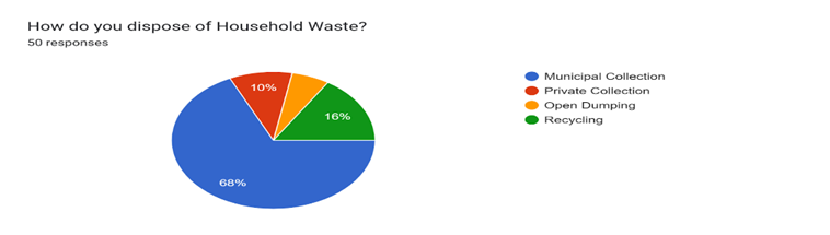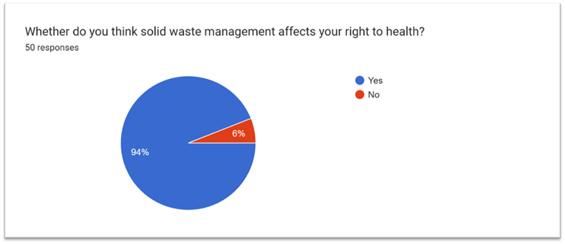 The survey findings disclosed critical insights into individuals’ awareness and conduct. Seventy-two percent of participants comprehended the correlation between effective waste management and public health. They recognized the significance of waste management. A remarkable 94% of participants firmly assert that solid waste management impacts their health. This indicates widespread public endorsement for this vital link. In all, 36% of interviewees indicated health problems resulting from inadequate waste management, highlighting its significant effect on community health. Victims reported health difficulties due to inadequate drainage, adverse environmental conditions, and accumulation of filth. Only 28% of individuals were aware of waste management regulations. This signifies a deficiency in legal understanding that may result in violations of waste management regulations. An impressive 94% of respondents acknowledge that clean air constitutes a human right. Despite their lack of understanding of the legislation, they acknowledge environmental rights.