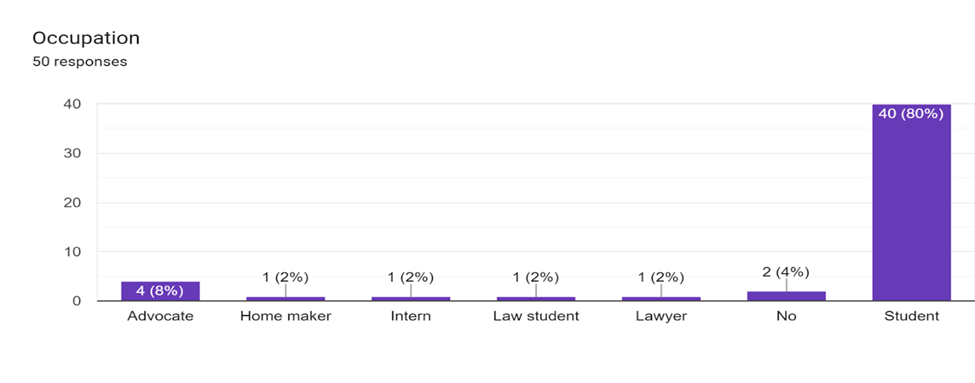 Approximately 35% of poll participants were aged 18–30, 40% were aged 31–45, 20% were aged 46–60, and 5% were over 60. A multitude of individuals possess varied educational backgrounds. 55% possessed doctorate degrees, 30% had completed higher secondary education, 12% had finished secondary education, and 3% had completed primary education. An analysis of income distribution reveals that 25% earn in excess of ₹50,000 monthly, while 40% earn between ₹25,000 and ₹50,000. Furthermore, 25% receive a monthly income of ₹15,000-₹25,000, whilst 10% earn below ₹15,000 each month. This diversified group provided insights into various social strata and life phases. 80% of the individuals surveyed were students. The remaining 4% comprised advocates (8%), homemakers (2%), interns (2%), law students (2%), attorneys (2%), and others. The sample’s considerable tilt towards academics may affect perceptions and knowledge acquisition positively.