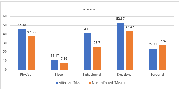 The findings indicate that stress levels are significantly higher in radiation-affected groups across physical, sleep, behavioural, and emotional domains. These results are consistent with prior studies of radiation and disaster-affected populations, which highlight the pervasive psychological consequences of environmental hazards (Bromet et al., 2011).